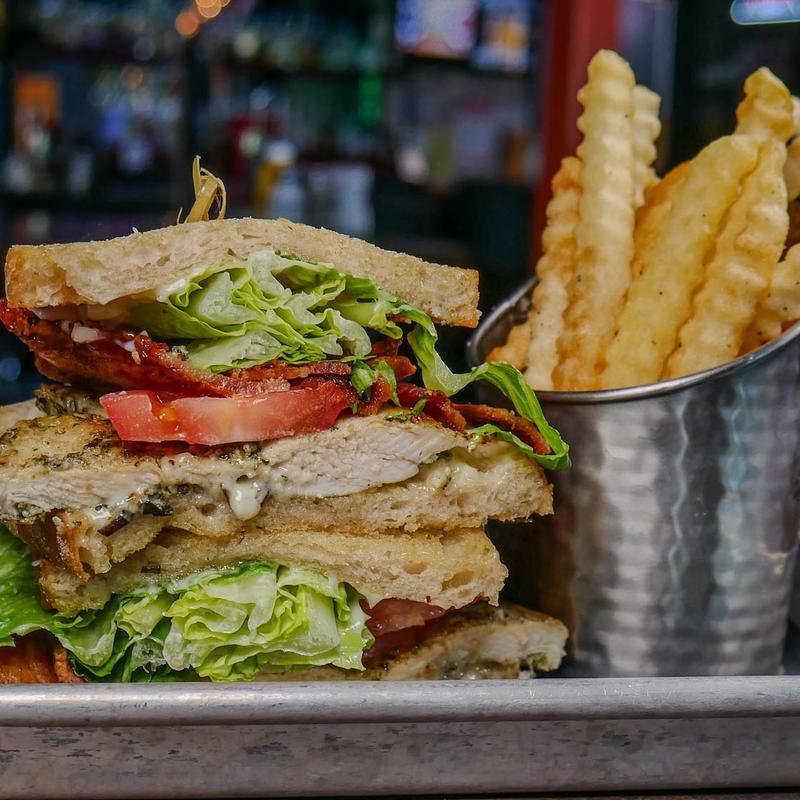 Smoked bacon, lettuce, and tomato. Topped with eggs and pesto mayo. Served with hash browns